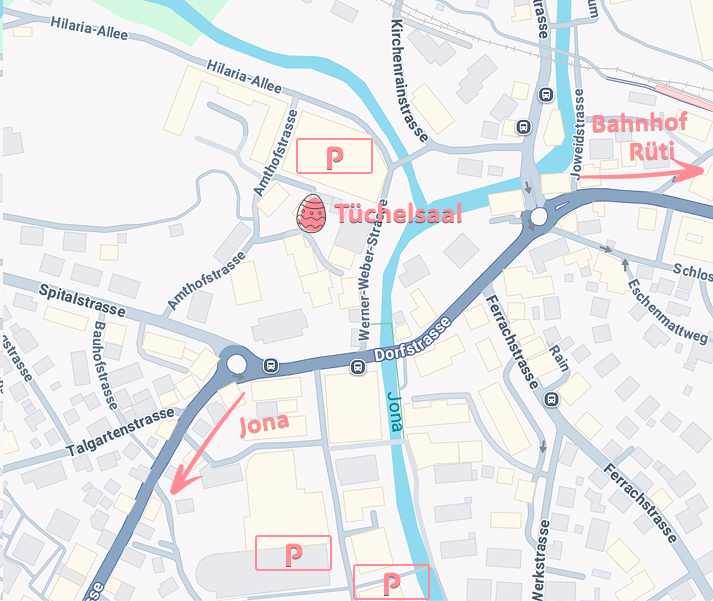 Parkplätze sind in Rüti alle kostenpflichtig. Vor dem Tüchelsaal hat es sehr wenige Parkplätze. Weitere Parkplätze finden sich bei der Migros und Coop, sowie auch beim Sonneplatz (süd-westlich vom Kartenausschnitt).